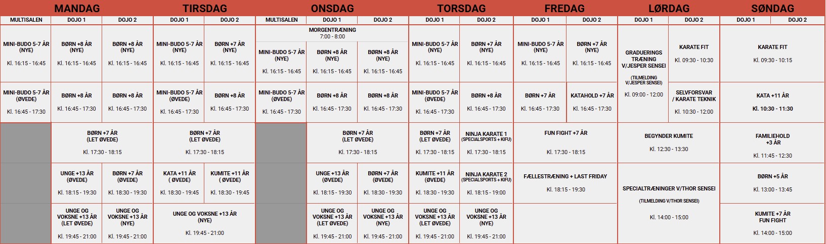 Der er åbent for aktiviteter i Dojoen hele dagen, men træningstider er efter ovenstående skema. Instruktører møder 15 - 30 minutter før træningen, hvis der er spørgsmål.